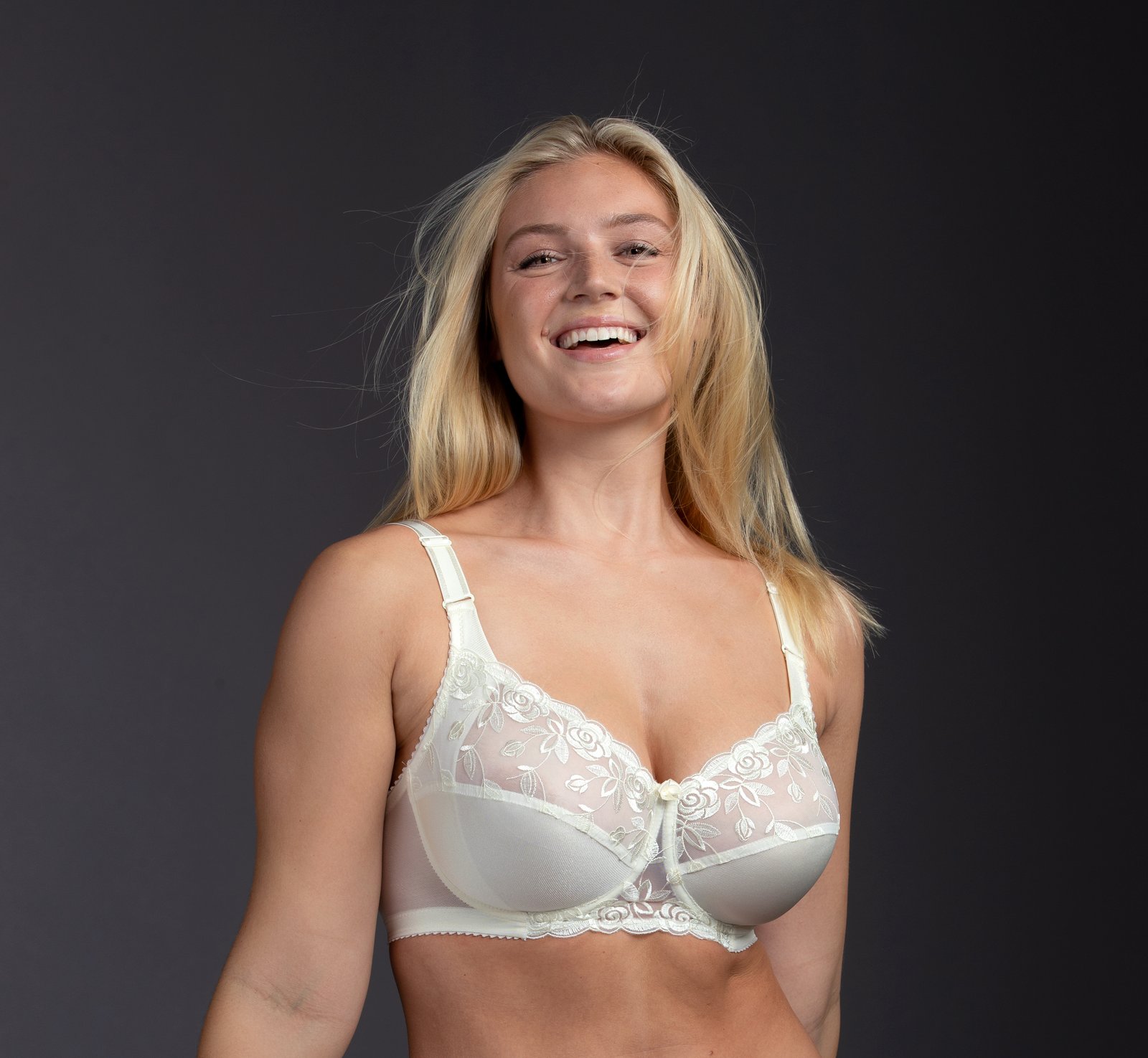 The Rose bra with charmeuse on the under cups and embroidered upper cups gives an elegant and luxurious impression.